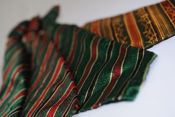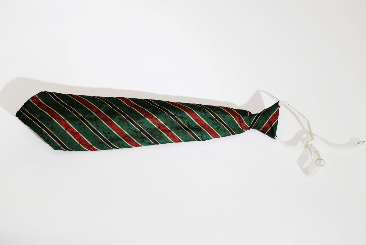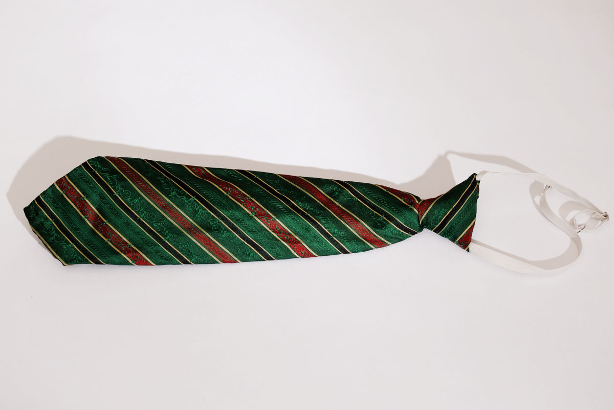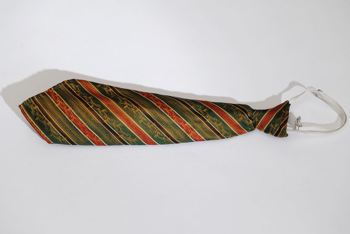 Das Reinseidenbindl ist handgefertigt, auf Gummi gebunden und individuell regulierbar.