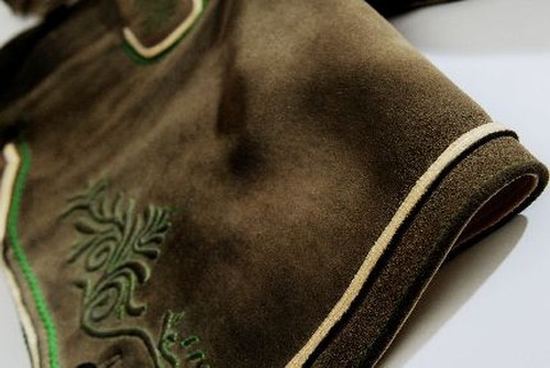 - Um einen feinen Velour zu erhalten wird das Leder vor dem Färben geschliffen. Nun folgt die Färbung: Die Hirschleder werden mehrmals mit Bürsten auf der Oberfläche - der ehemaligen Narbenschicht - mit Farbstoffen wie Blau- und Gelbholzextrakt eingefärbt.